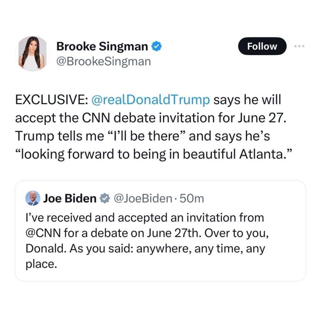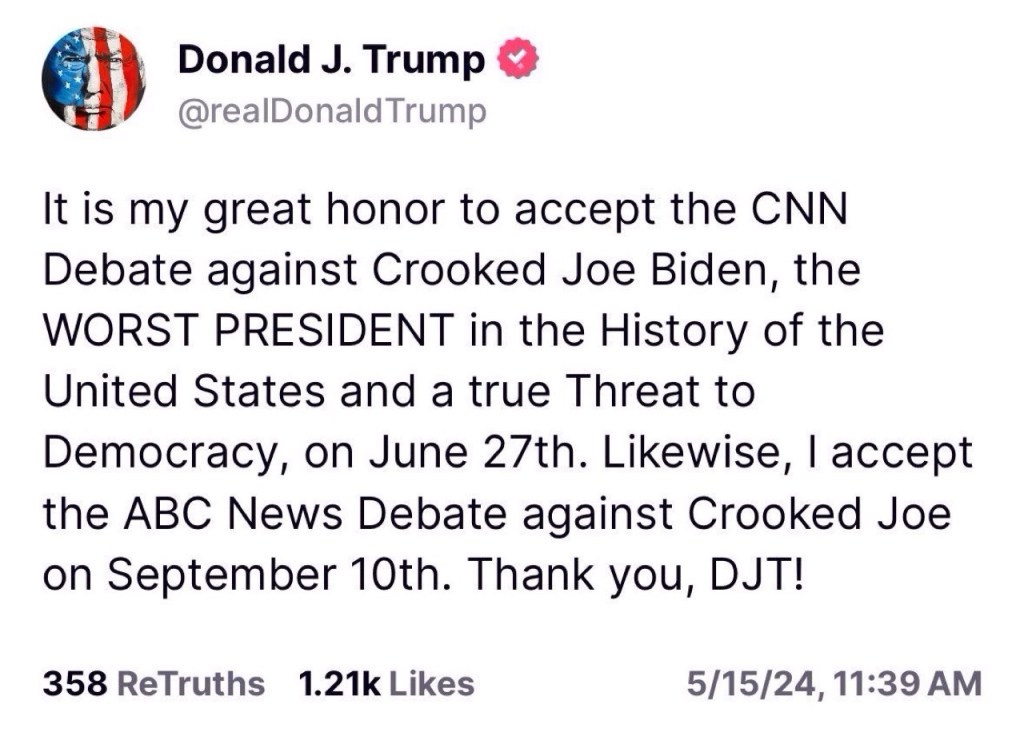 🚨BREAKING: Trump has now accepted two presidential debates with Crooked Joe on June 27th on CNN and on Sept 10th on ABC News.