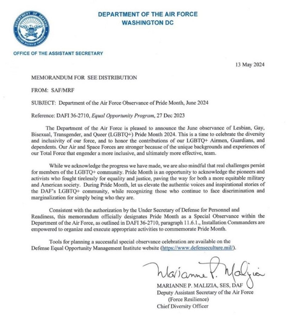 “The Department of the Air Force is pleased to announce the June observance of Lesbian, Gay, Bisexual, Transgender, and Queer (LGBTQ+) Pride Month 2024. This is a time to celebrate the diversity and inclusivity of our force, and to honor the contributions of our LGBTQ+ Airmen, Guardians, and dependents. Our Air and Space Forces are stronger because of the unique backgrounds and experiences of our Total Force that engender a more inclusive, and ultimately more effective, team.”