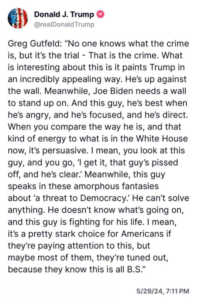The fact that this case was ever even brought to trial is a disgrace to the American justice system. There has never been a bigger example of lawfare being used to interfere in a presidential election than this bogus case and everyone knows it.