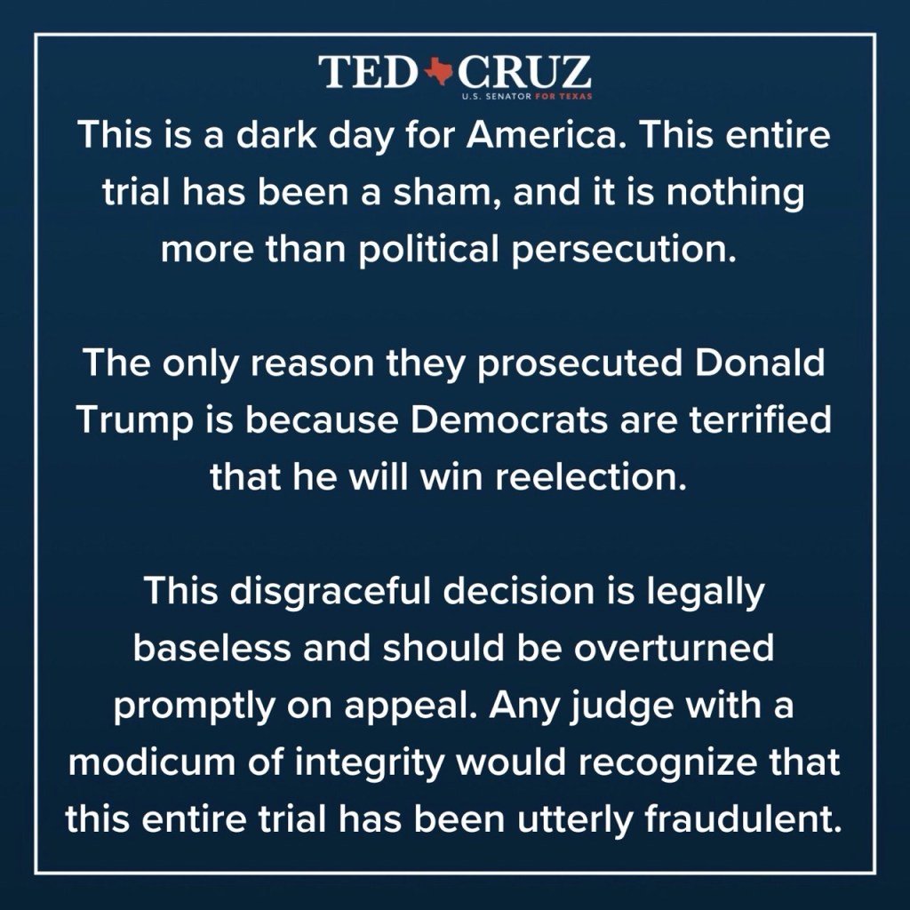 Today is a shameful day in American history. Democrats cheered as they convicted the leader of the opposing party on ridiculous charges, predicated on the testimony of a disbarred, convicted felon. This was a purely political exercise, not a legal one.