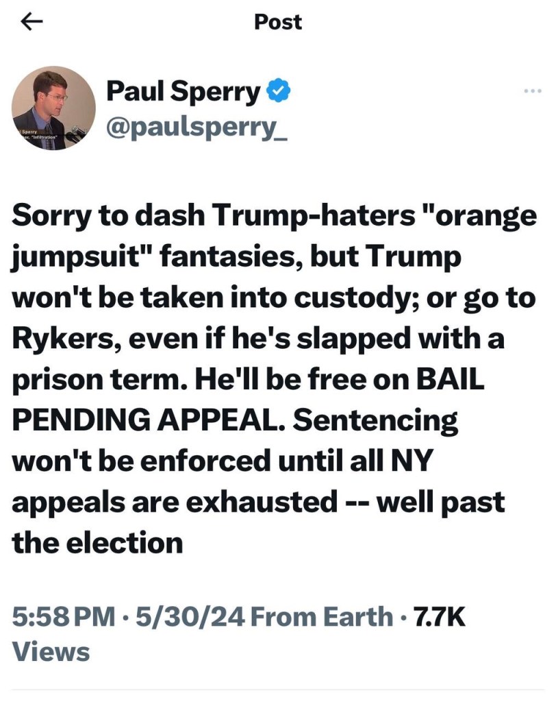 Guilty on 34 counts, but no underlying crime. Partisan hacks serving as judges, investigators, and prosecutors have turned our legal system into a farce at both the state and federal level.