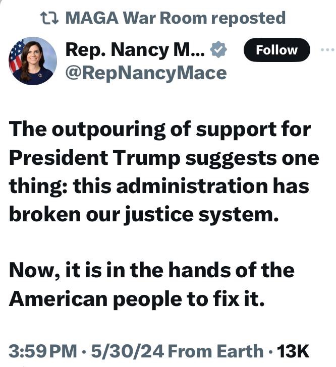 The American people see this as lawfare, and they know it is wrong—and dangerous. President Trump will rightfully appeal this absurd verdict—and he WILL WIN!