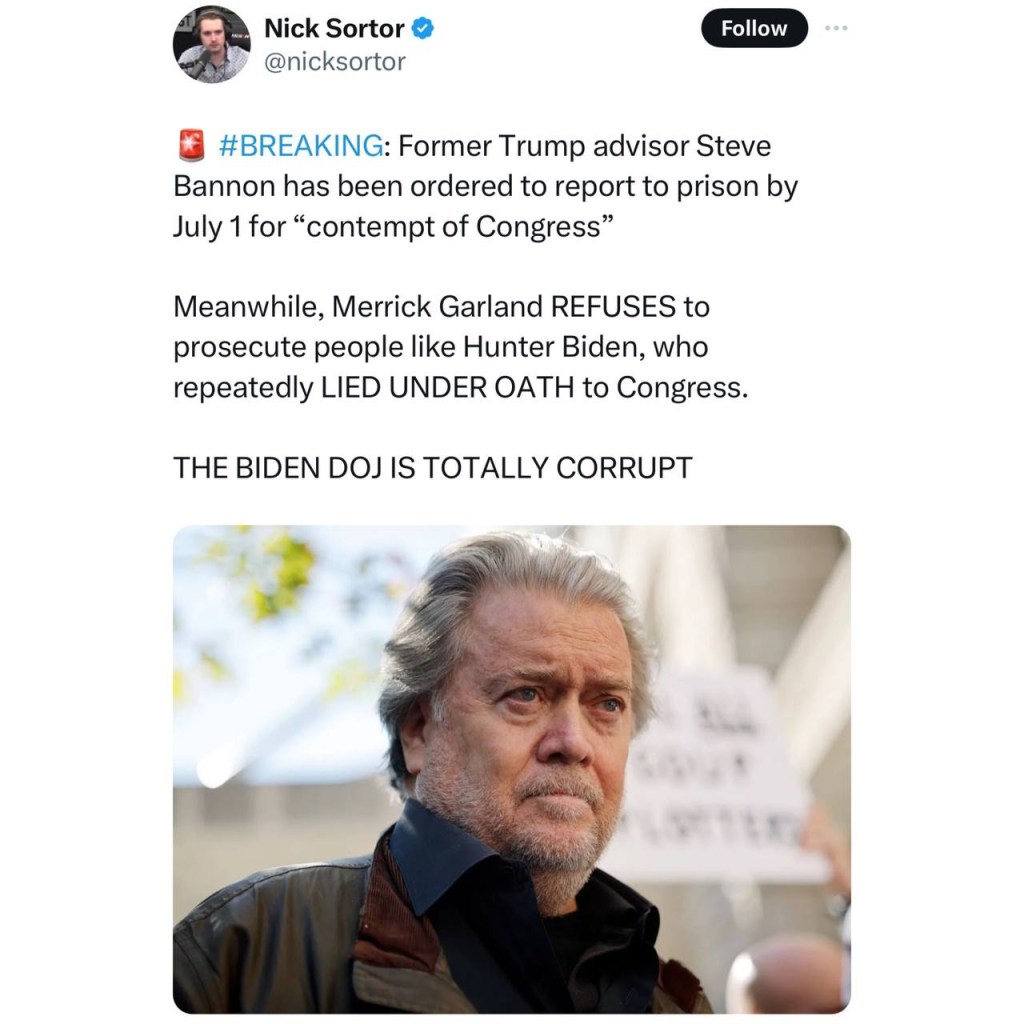Steve Bannon is going to prison July 1st because he was held in contempt of Congress by the FAKE Jan 6th Committee that was set up by Nancy Pelosi against House rules.