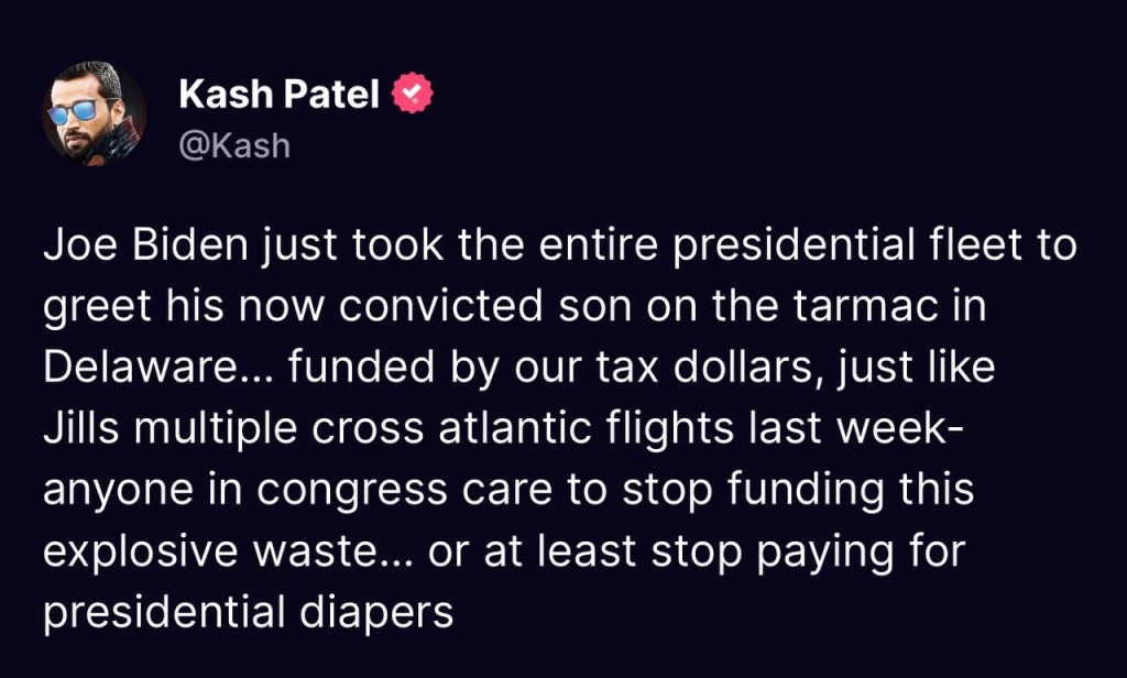 Joe Biden just took the entire presidential fleet to greet his now convicted son on the tarmac in Delaware… funded by our tax dollars, just like Jills multiple cross atlantic flights last week- anyone in congress care to stop funding this explosive waste… or at least stop paying for presidential diapers