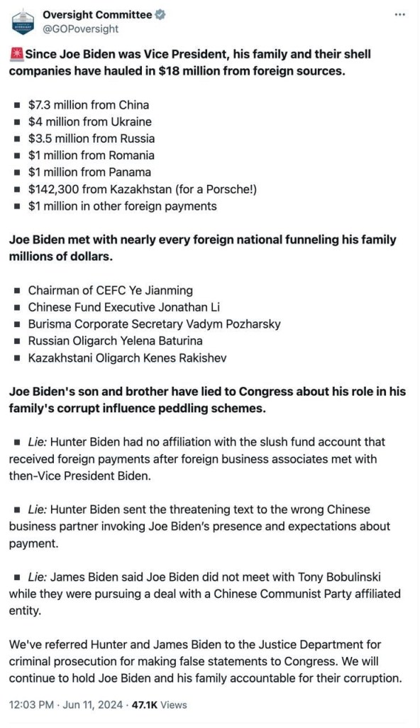 The Biden Crime Family sold “the brand” and access to “the Big Guy” to line their pockets beyond their wildest dreams, all at the expense of the American people and national security.