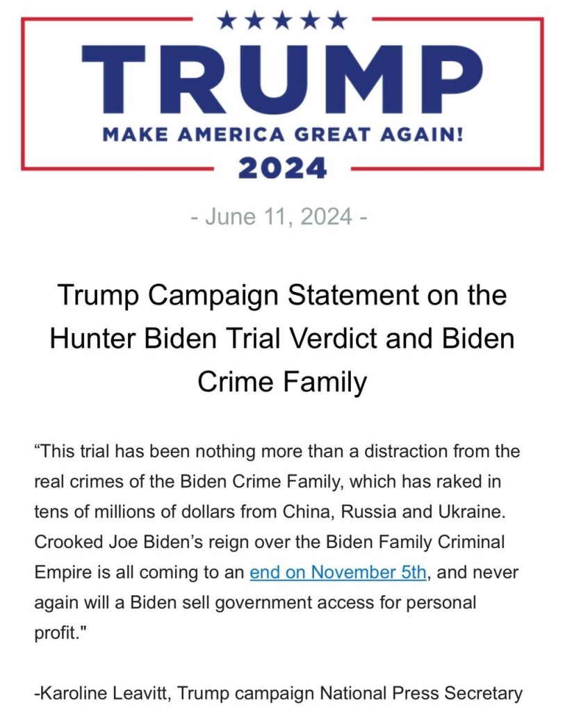 I’ve said it before and I’ll say it again: the Hunter Biden trial was a sham. It’s a smoke screen to legitimize the Trump conviction & to deflect attention from the Biden family’s actual likely crimes: selling off our foreign policy to make their family rich. Don’t fall for it.