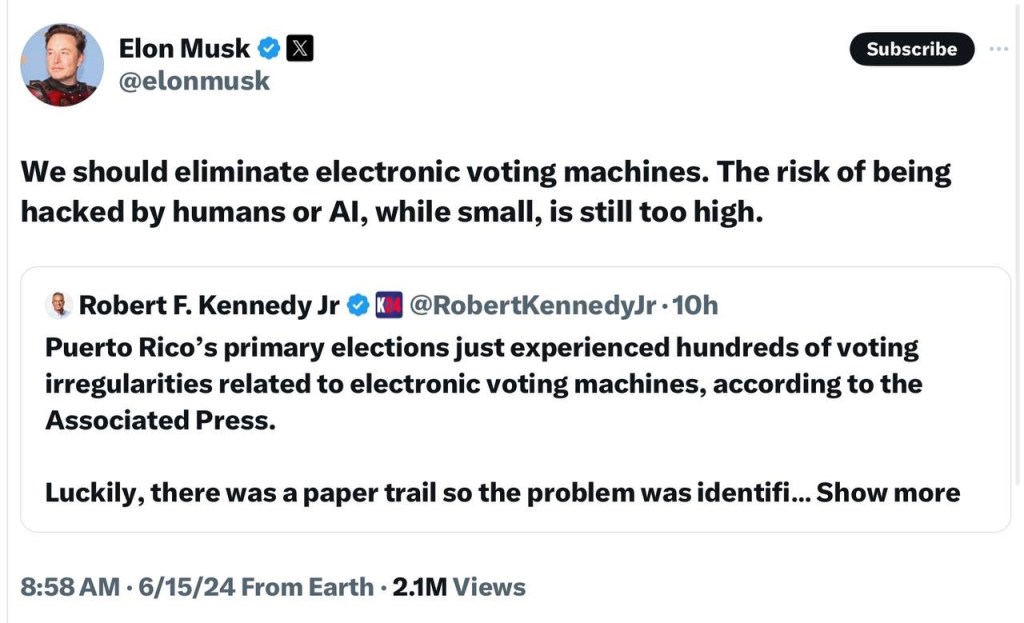 We should eliminate electronic voting machines. The risk of being hacked by humans or AI, while small, is still too high.