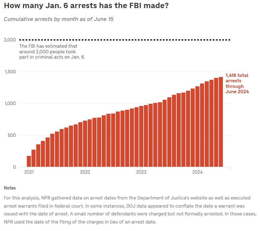 [J6 Arrests: June 15, 2024] Note the intent to pursue charges against an additional 600 Americans and the acceleration in arrests as evidenced by the spike in the distribution curve.