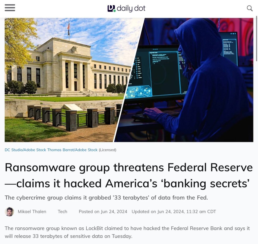 The ransomware group known as LockBit claimed to have hacked the Federal Reserve Bank and says it will release 33 terabytes of sensitive data on Tuesday