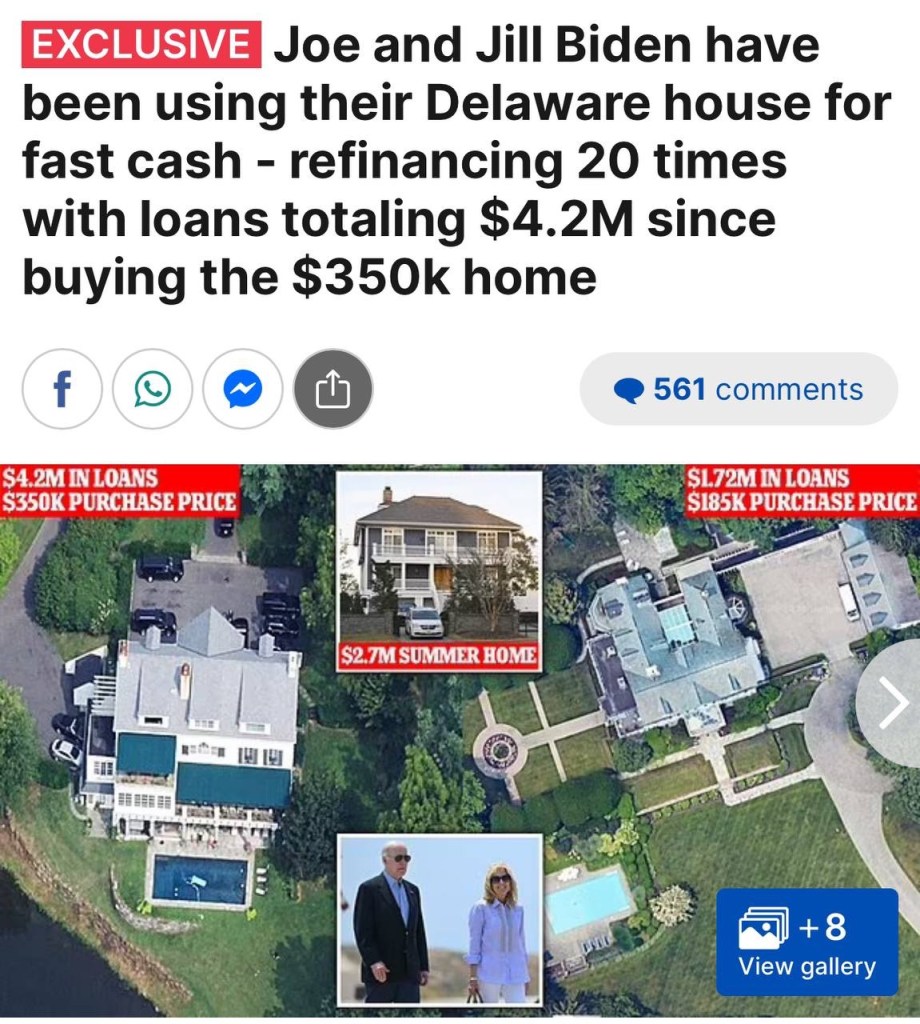 Joe and Jill Biden have been using their Delaware house for fast cash – refinancing 20 times with loans totaling $4.2M since buying the $350k home 🤔