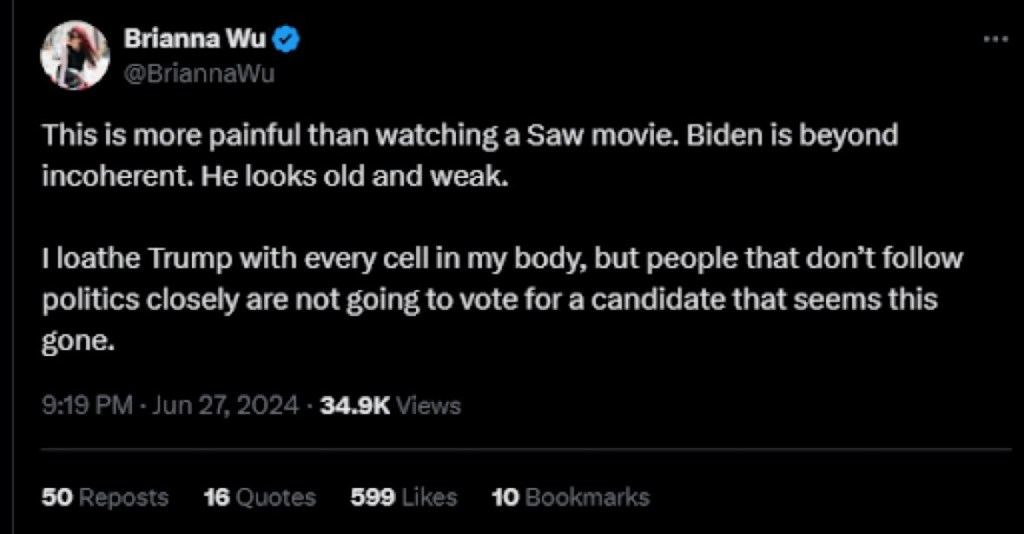I absolutely did not think Biden would be as bad as this, weak, feeble, stammering, robotic, whiny, looks like he sees the Grim Reaper standing behind the moderators.