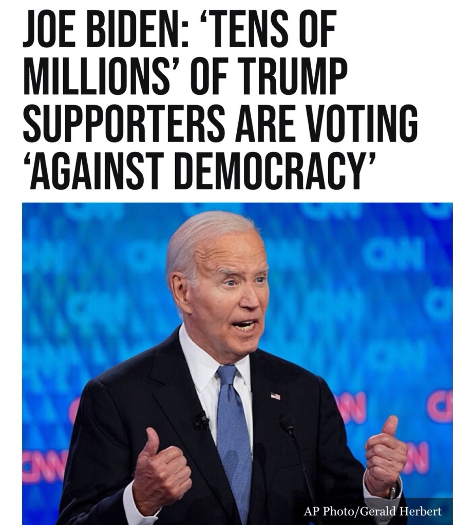 Joe Biden attacked tens of millions of Americans during the first 2024 presidential debate against Donald Trump, claiming that Trump supporters are voting “against democracy.”