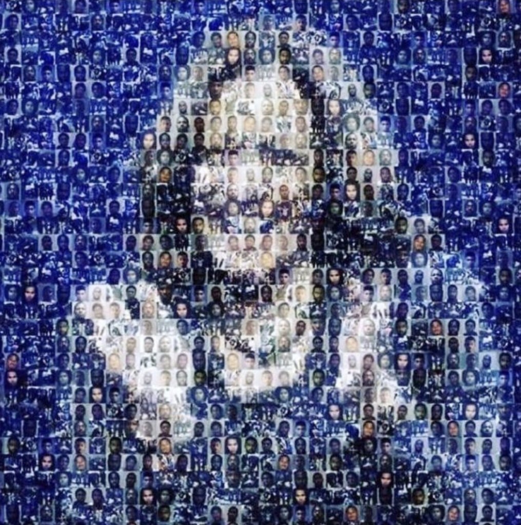 Here is a mosaic of Kamala Harris, made out of the black men she kept in prison beyond their sentences to use as free labor for the State of California.