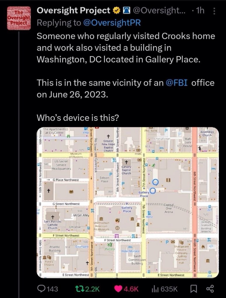 “Someone who regularly visited Crooks home and work also visited a building in Washington, DC located in Gallery Place.