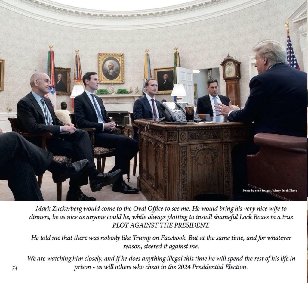 “Mark Zuckerberg would come to the Oval Office to see me. He would bring his very nice wife to dinners, be as nice as anyone could be, while always plotting to install shameful Lock Boxes in a true PLOT AGAINST THE PRESIDENT.”