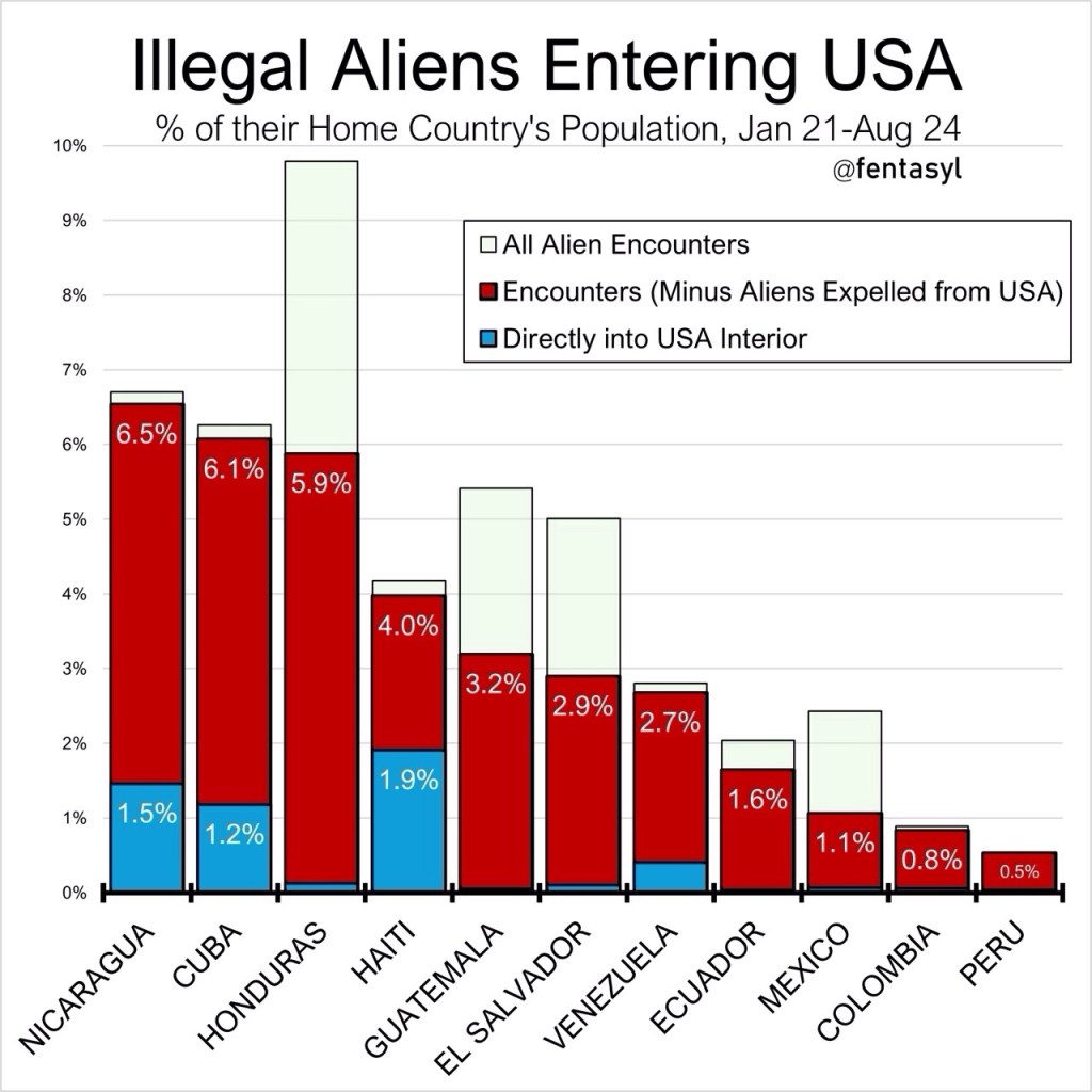– ~6% each of the populations of Nicaragua, Cuba, & Honduras have entered the USA since Jan 2021.