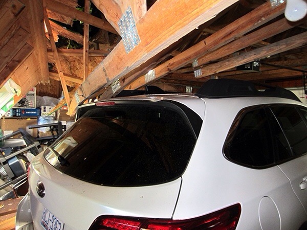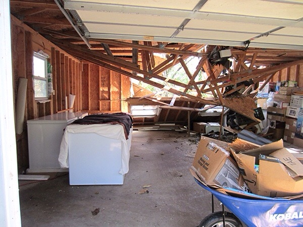 When we felt it was safe to pull back the drapes and look out of the windows, the first thing we saw was the back of the garage, which is visible from our dining area. Four trees had fallen onto the roof and crushed it.