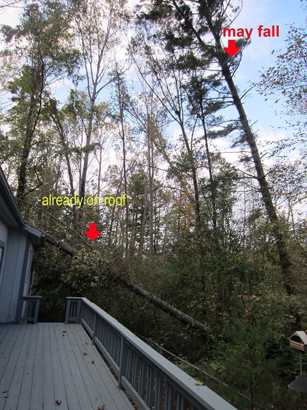 On September 27, there was still a very tall pine leaning toward the house that could fall and crush the roof. I reported this to the owner and the property manager using my cell phone, but nothing was done about it.