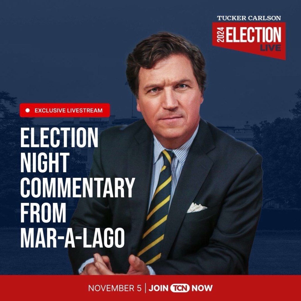 Join us for the only show broadcasting from Mar-a-Lago on election night. Get our real-time commentary with special guests from Trump’s inner circle. Streaming tomorrow at 7:30 ET on YouTube, X, TuckerCarlson.com, and on the TCN TV app.