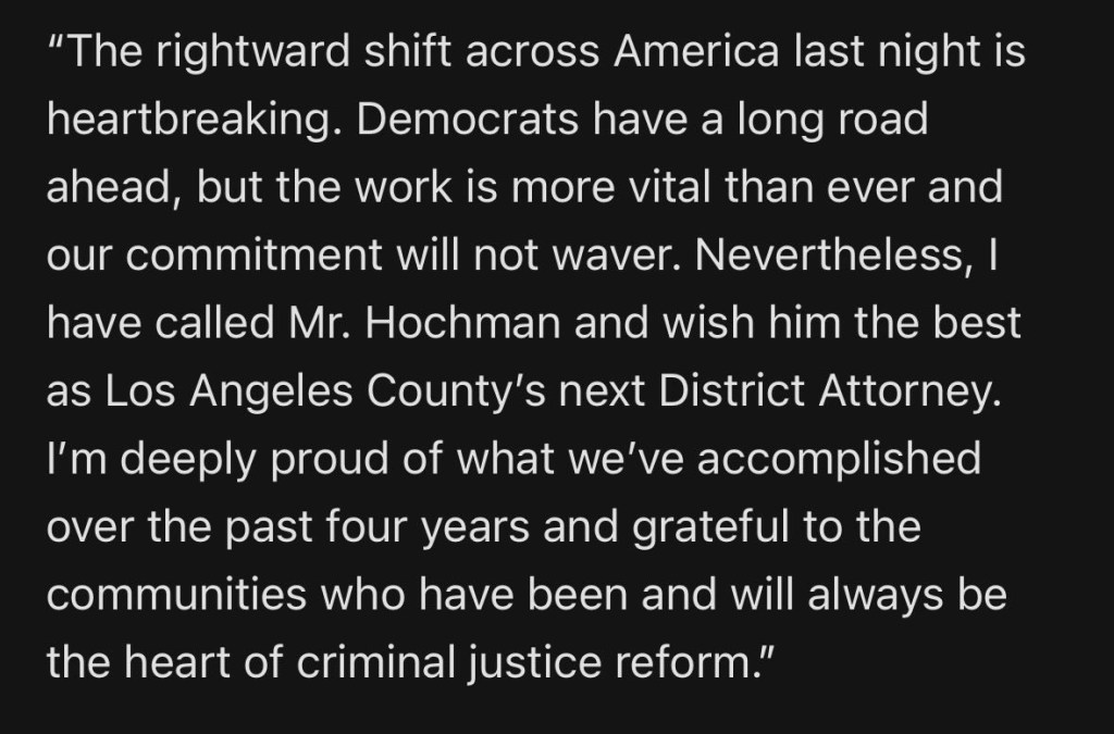 “The rightward shift across Amer9ca last night is heartbreaking,” Gascon said in a statement on Wednesday.