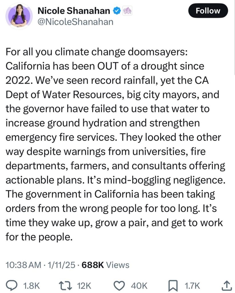 For all you climate change doomsayers: California has been OUT of a drought since 2022. We’ve seen record rainfall, yet the CA Dept of Water Resources, big city mayors, and the governor have failed to use that water to increase ground hydration and strengthen emergency fire services. They looked the other way despite warnings from universities, fire departments, farmers, and consultants offering actionable plans. It’s mind-boggling negligence. The government in California has been taking orders from the wrong people for too long. It’s time they wake up, grow a pair, and get to work for the people.