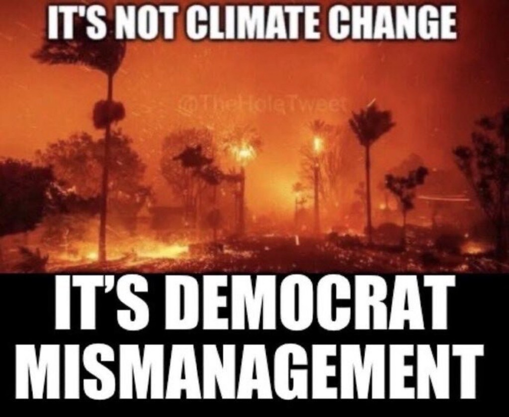 As a new wave of fire and high winds threaten Los Angeles, the media is reporting that California’s elected leaders are not to blame and that right-wing influencers and Donald Trump are spreading misinformation and politicizing a tragedy. Racial and gender quotas through DEI aren’t to blame. No, Mayor Karen Bass didn’t cut the Fire Department’s budget. No, Gavin Newsom didn’t cut CalFire’s wildfire prevention budget. And no, there wasn’t any way to prevent these fires or the fire hydrant water from running out. Climate change made the disaster inevitable due to “whiplashing” rain levels.