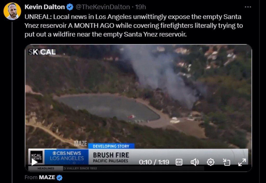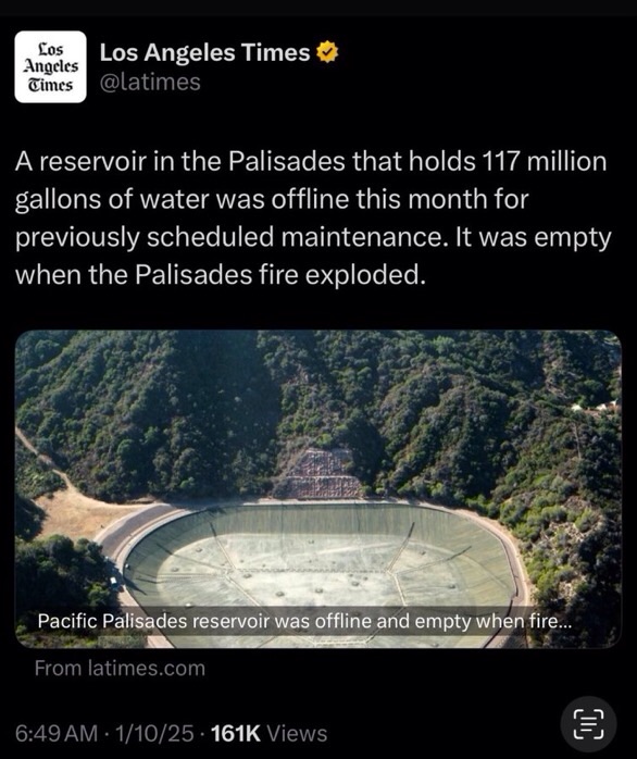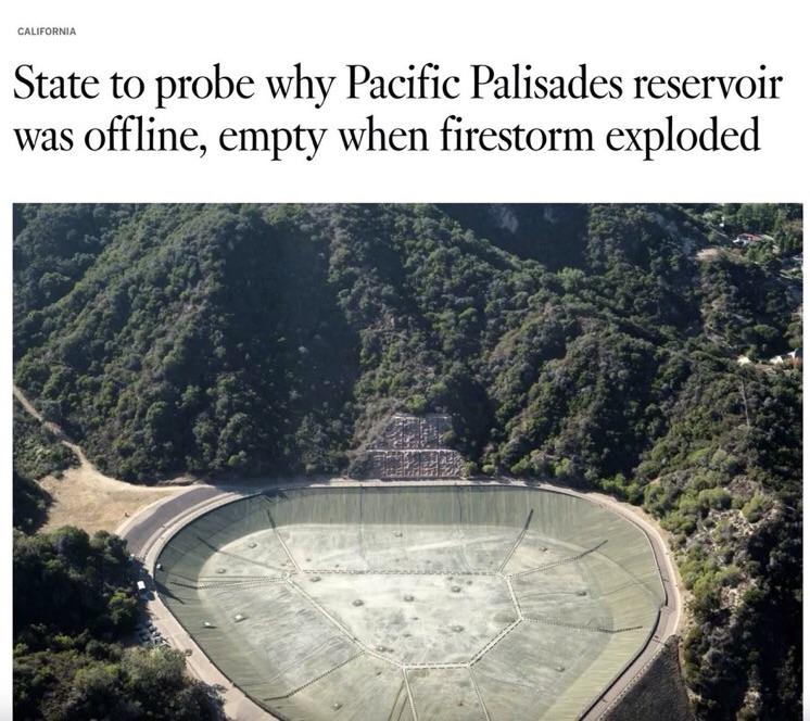 And not only was the Santa Ynez reservoir off-line, there is good reason to believe that it could have been the difference-maker in the Pacific Palisades fire, which continues to rage out of control, with just 11% of it contained.