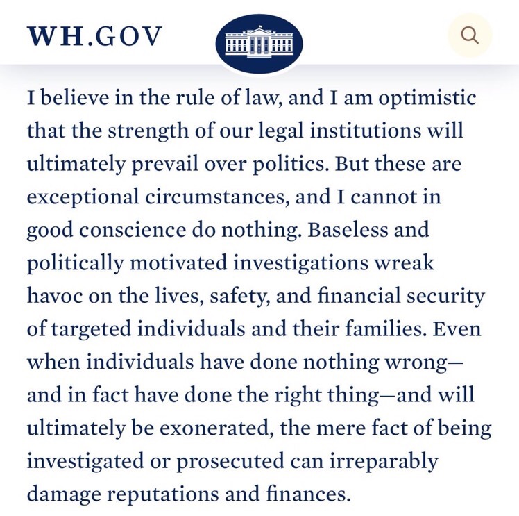 “That is why I am exercising my authority under the Constitution to pardon General Mark A. Milley, Dr. Anthony S. Fauci, the Members of Congress and staff who served on the Select Committee, and the U.S. Capitol and D.C. Metropolitan police officers who testified before the Select Committee. The issuance of these pardons should not be mistaken as an acknowledgment that any individual engaged in any wrongdoing, nor should acceptance be misconstrued as an admission of guilt for any offense. Our nation owes these public servants a debt of gratitude for their tireless commitment to our country.”