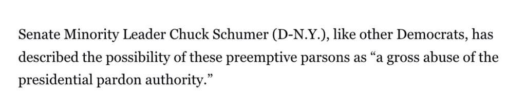 Senate Minority Leader Chuck Schumer once said using preemptive pardons would be a “gross abuse of the presidential pardon authority.”