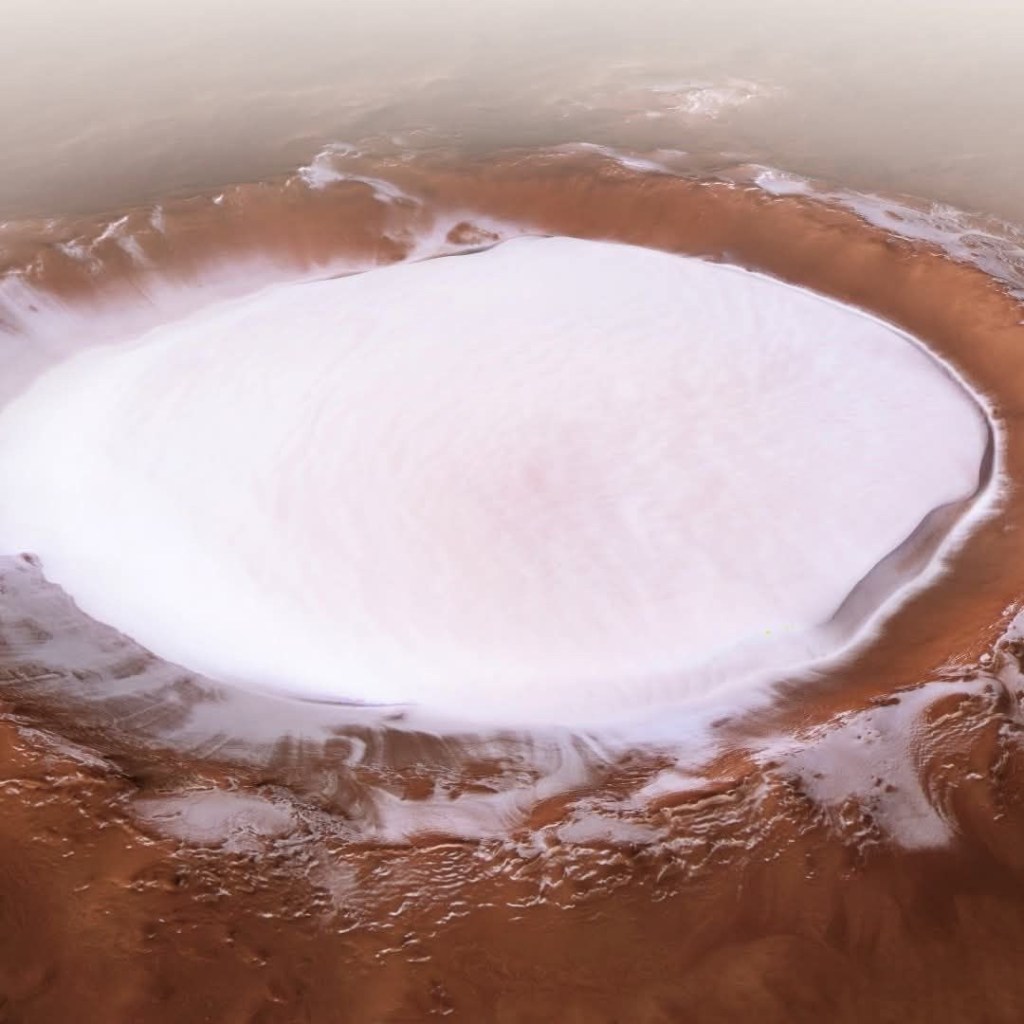 Korolev crater on Mars resembles a vast field of snow but is actually filled with ice. The crater, located in Mars’ northern lowlands near the Olympia Undae dune fields, spans 82 kilometers and has a central ice mound up to 1.8 kilometers thick that remains year-round due to a unique “cold trap” phenomenon.