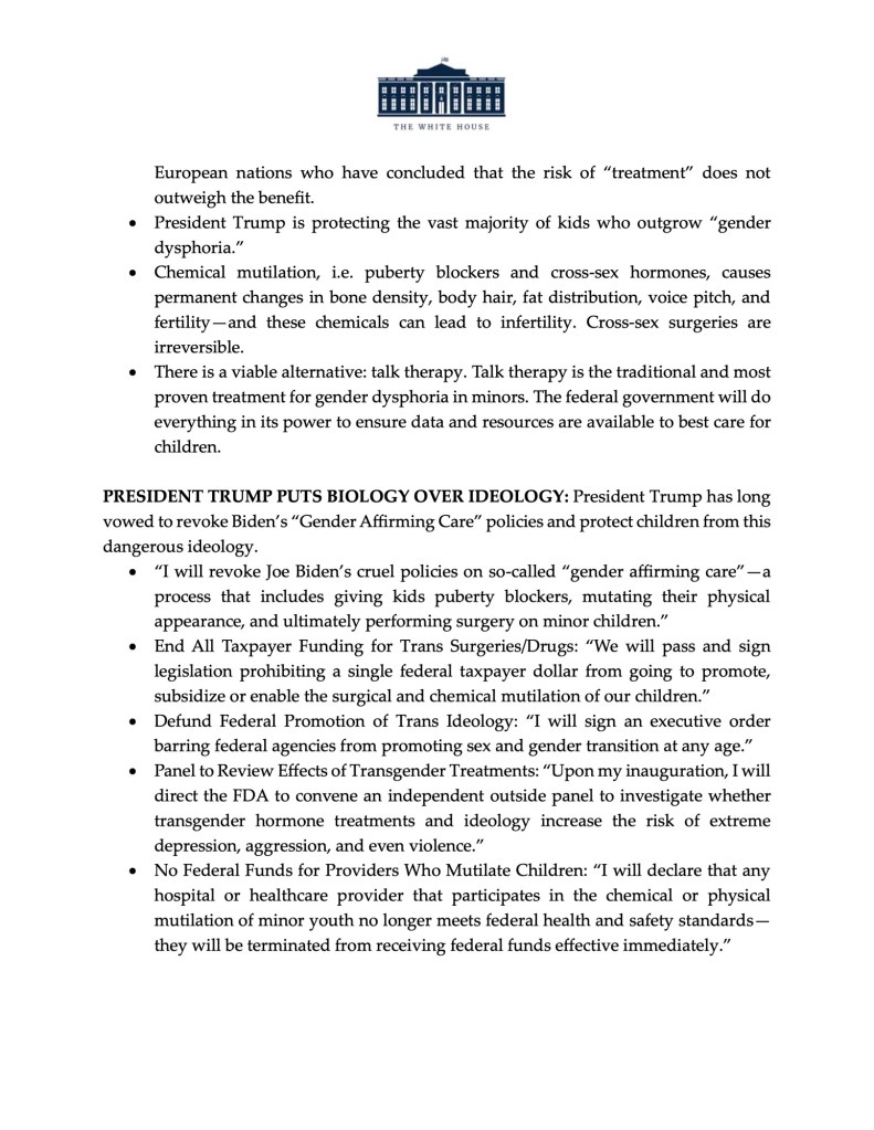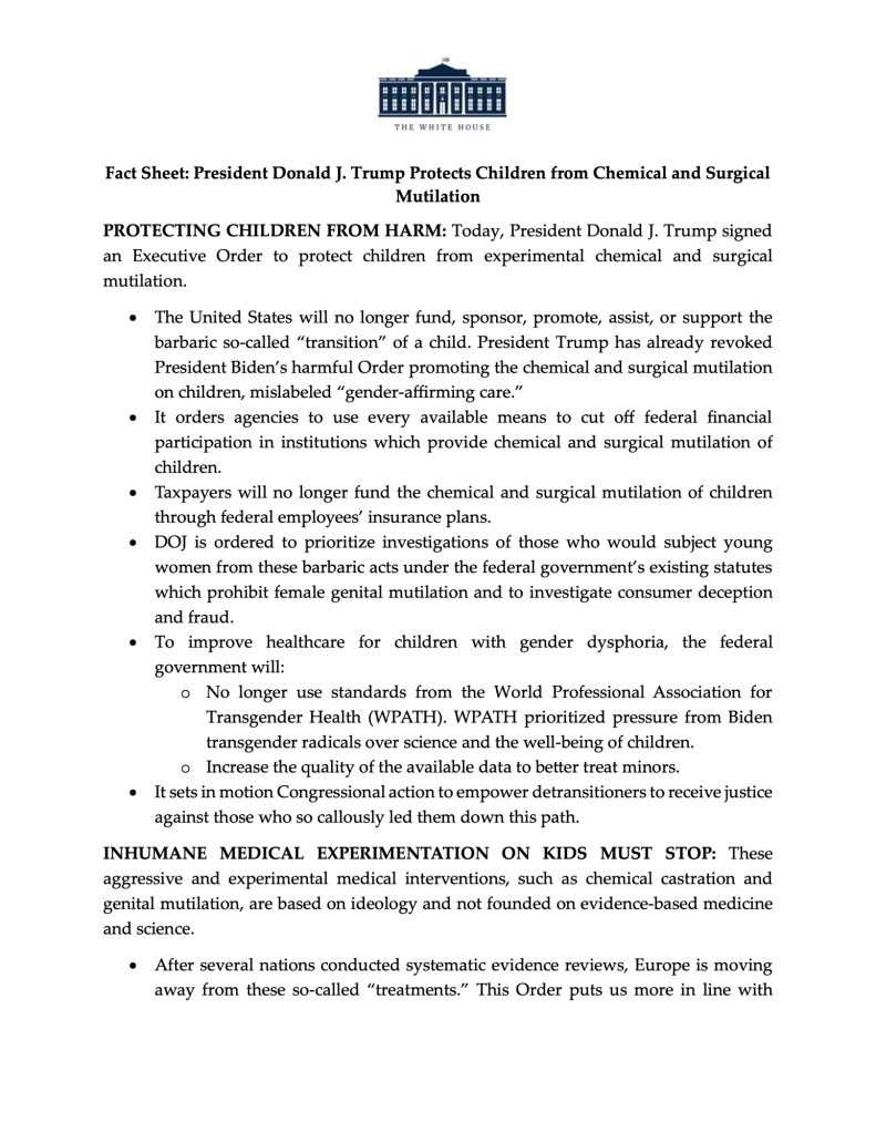 This EO also directly cuts off ALL federal funding for surgical and chemical mutilation, including grants to hospitals and universities that rely on these grants to advance the practice. This will have downstream benefits of defunding researchers, predatory doctors, drug makers, and policy activists who profit from abusing minors.