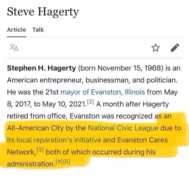 As Mayor, @MayorHagerty created a REPARATIONS PROGRAM for black residents. The Evanston Reparations Committee was established by the City Council of Evanston, Illinois in 2019 as the FIRST publicly funded reparations program for Black Americans in the US.