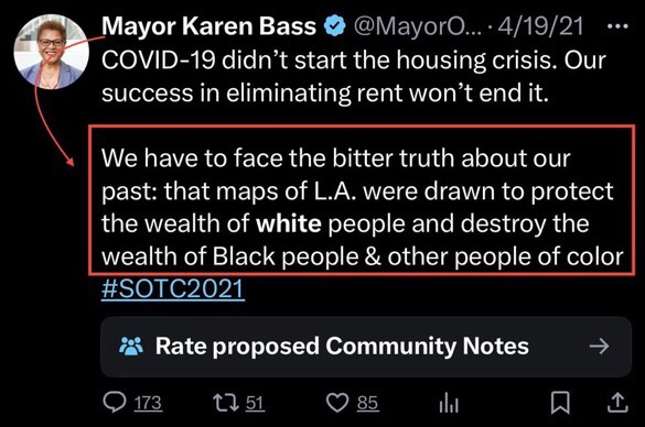 Karen Bass has previously said that she thinks “that maps of L.A. were drawn to protect the wealth of white people and destroy the wealth of Black people & other people of color”.