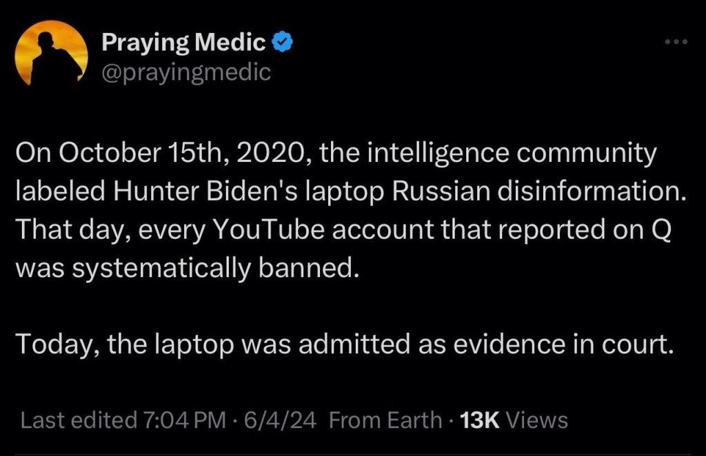 Man, I seem to remember when the media called Hunter’s Laptop Russian Disinformation and YouTube banned my 300K subscriber Youtube account for reporting on it the day it came out in 2020