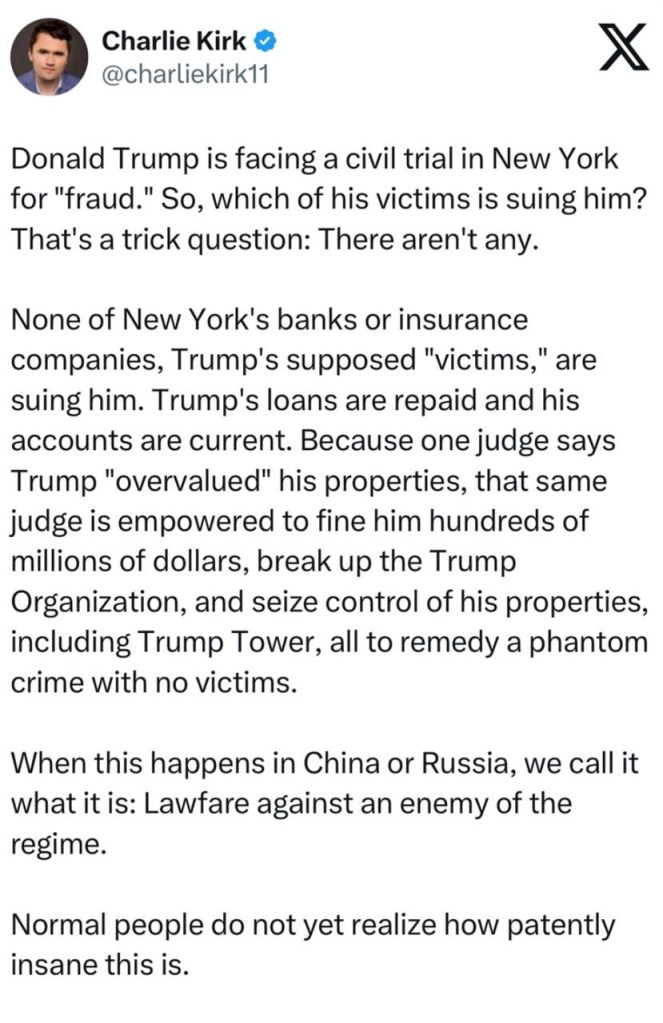 Our expert witness was incredible in court today. Won every single point, with strength, but grace. It wasn’t even close. The A.G.’s people had NO ANSWERS! This highly respected expert said this case is a disgrace, should never have been brought, and should be dropped immediately – that my financials are the best he has ever seen as an expert. They should be ashamed. They’ve got nothing other than a corrupt Attorney General, who ran on, “I will get TRUMP,” and a Trump Hating Radical Left Judge, who may be crazy. NO JURY, NO VICTIM, A NEVER USED FOR THIS PURPOSE STATUTE, A TOTALLY DISCREDITED STAR WITNESS WHO ADMITTED HE LIED DURING HIS TESTIMONY, WHICH WOULD HAVE CAUSED ANY OTHER JUDGE IN THE COUNTRY TO THROW OUT THIS BIDEN ATTACK ON HIS POLITICAL OPPONENT. WE KEEP ASKING FOR DISMISSAL, BUT THE TRUMP HATER (JUDGE) WON’T LET IT GO. AN INSULT TO AMERICA! HE RULED THAT I WAS A FRAUD BEFORE HE EVEN SAW THE CASE, THEN TRIED TO GET ME TO SETTLE. A TOTAL HIT JOB. MAR-a-LAGO AT $18,000,000??? —DJT
